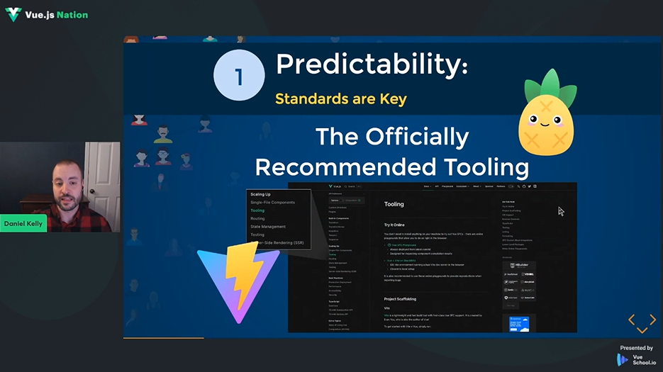 Daniel Kelly, head instructor at Vue School, spoke next on patterns for large-scale Vue.js applications. Daniel discussed several crucial topics to consider while developing a large -scale Vue.js application, such as predictability, standards, testing, and more.