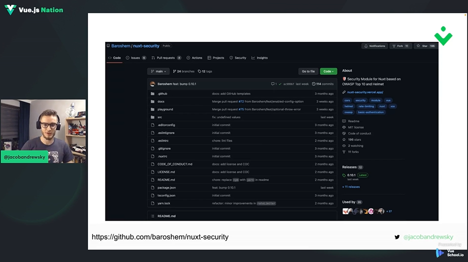 Jakub Andrzejewski, Senior Developer at VueStoreFront and Google Developer Expert in Performance, followed with a talk on Nuxt 3 Security. Jakub began by addressing some recommendations for considering security in our application, as well as certain security concerns that we as developers should be aware of. He also introduced the Nuxt security module and provided a few code examples of how to use it in a Nuxt application.