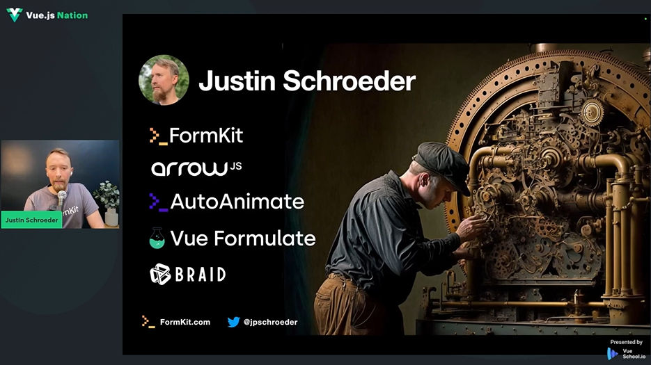 After a brief intermission, Justin Schroeder, the inventor of FormKit, took the stage. Justin began by discussing forms and some common misconceptions about establishing inputs and forms. Justin then introduced us to FormKit, a form building framework, and then followed with a live coding session to outline some of the features in FormKit.