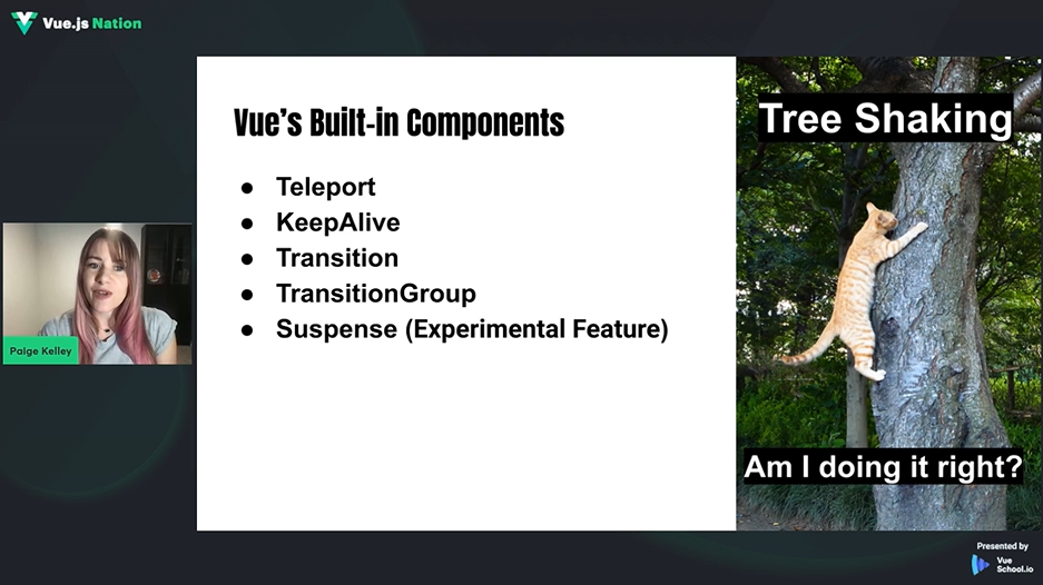 Paige Kelley followed with a presentation on Vue 3's built-in components. She discussed the five built-in components, which are suspense (experimental), transition, transition-group, teleport, and keep-alive. She then demonstrated some of these built-in components in action in a live coding session.