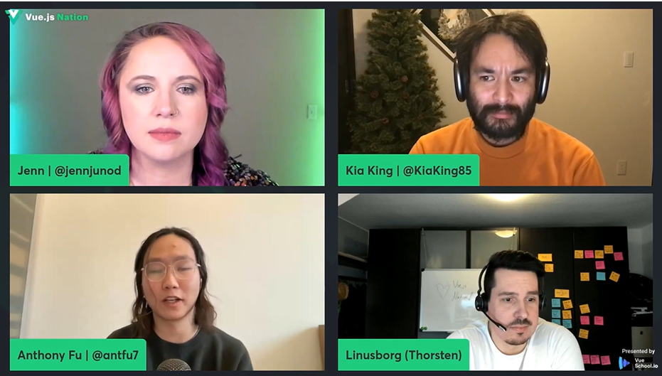 Anthony Fu, Kia King, and Thorsen comprised the team. They had a lot of questions from the audience about what's ahead with Vue.js, some framework features, Vitest, Vitepress, and open-source.