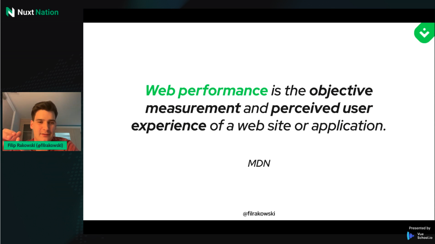 Following a quick coffee break, Filip Rakowski, CTO of Vuestorefront, spoke about how Nuxt is making our applications faster. Filip discussed the benchmarks used to test the performance of a meta framework and if Nuxt is doing well in comparison to these benchmarks. Filip also evaluated performance for several frameworks with varying app complexities to check how Nuxt compared to other frameworks such as react, svelte, gatsby, qwik, and others. Nuxt performed admirably. Filip also discussed nuxt-font-metrics and other strategies and concepts for improving the performance of our nuxt application.