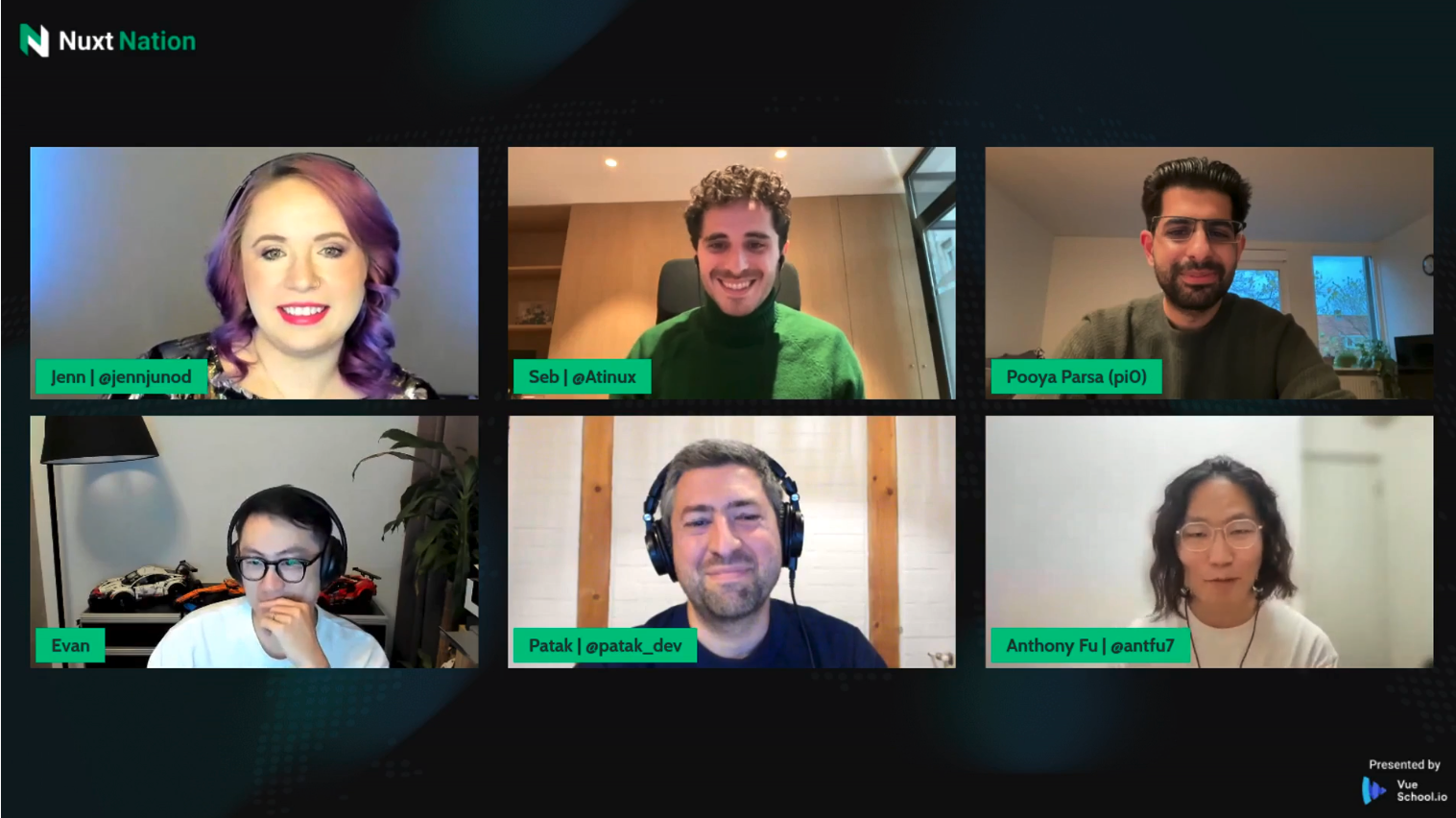 A live panel discussion with the key team members of Nuxt and Vite was held to kick off day 2 of Nuxt Nation. During the discussion, they discussed how these two brilliant frameworks can complement one another and revealed opportunities for future development. Anthony Fu, Evan You, Matias Capeletto, Sébastien Chopin, and Pooya Parsa made up the panel. During the discussion, many questions were raised and a wealth of knowledge was provided regarding integrating Nuxt with Vite and the open source community.Anthony also spoke on plans to integrate vitest with Nuxt 3.
