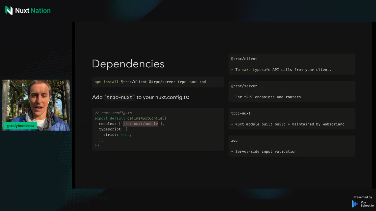 After a brief coffee break, Cody Bontecou took the stage to discuss type safety and tRPC. Cody defined type safety as having a single source of truth for your types across all levels of your application. End-to-end type safety is having a compiler that checks types during building and raises an error when you assign the incorrect type to a variable. Additionally, tRPC (typescript Remote Procedure Call) is a method of exposing server functions to the client in typesafe manner. Cody explained that this is only required when you are using typescript in your backend and frontend. Cody then introduced us to some tRPC modules with some installation and usage guides.