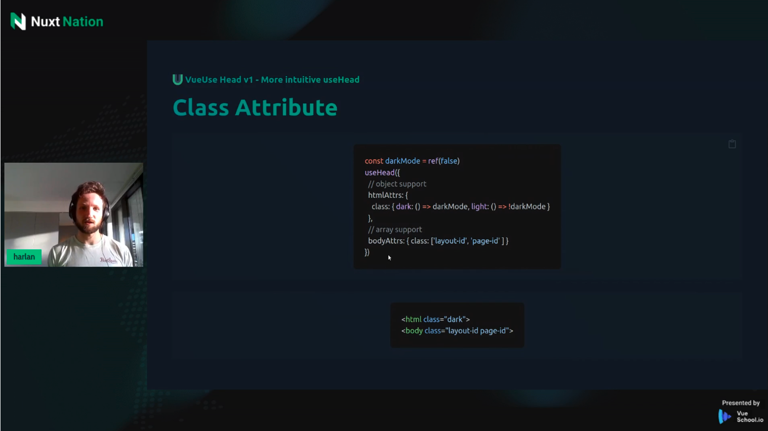 Open-source developer Harlan Wilton spoke next and discussed SEO and Meta Data with Nuxt 3 Harlan started out by discussing the new "useHead()" component that handles SEO and meta data. He advised to avoid wrapping a watcher in useHead(). He then discussed some of the newest functions, including plugins for the useHead() composable.