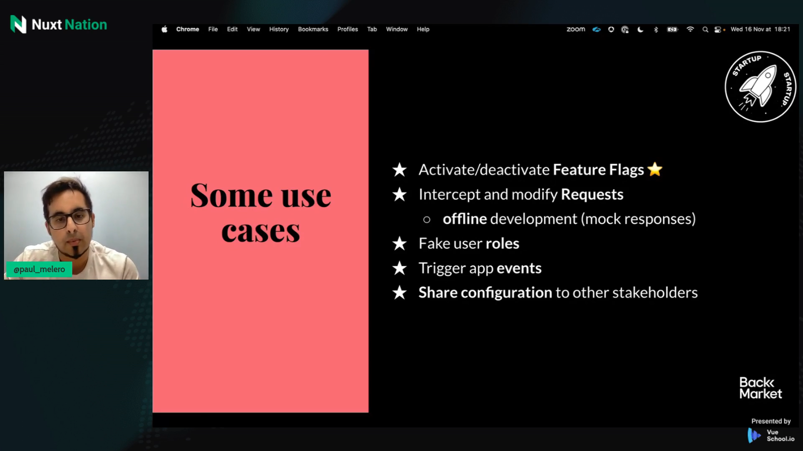 Paul Melero from BackMarket was the next to speak and he spoke on creating custom devtools. He explained this is necessary to activate/deactivate feature flags, intercept requests, fake user roles, or share your configuration.