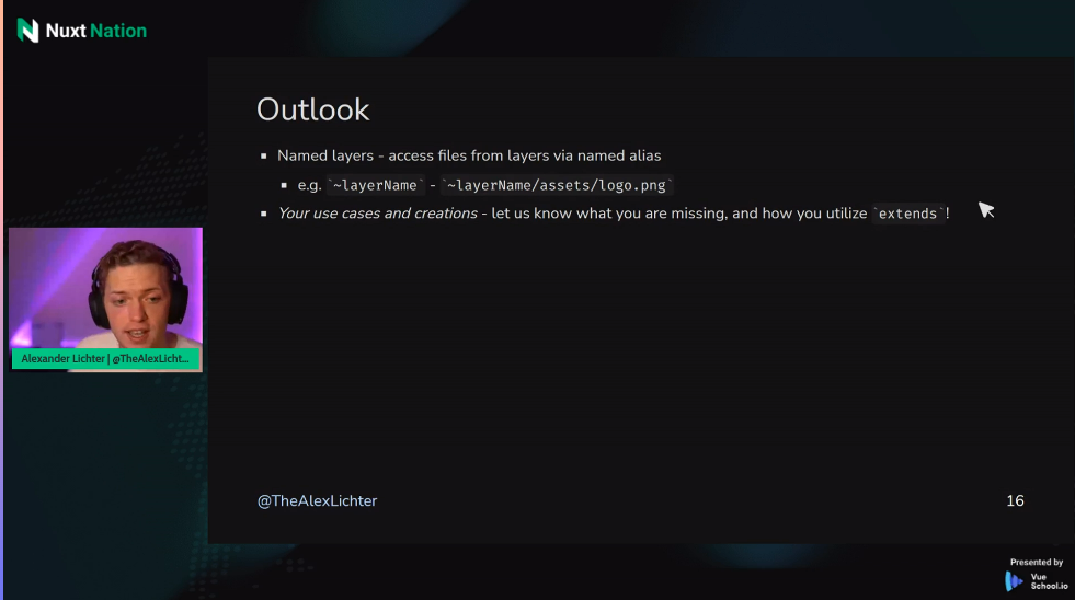 Alexander Lichter was the next speaker, and he spoke about how to extend existing Nuxt apps into your own Nuxt app. This is built on a brand-new feature called ‘extends’, which, as the name suggests, allows you to build extensions for your Nuxt applications based on other projects, such as your own "base template" or a whole separate GitHub repository. Here are some information about the new "extends" function from his speech.