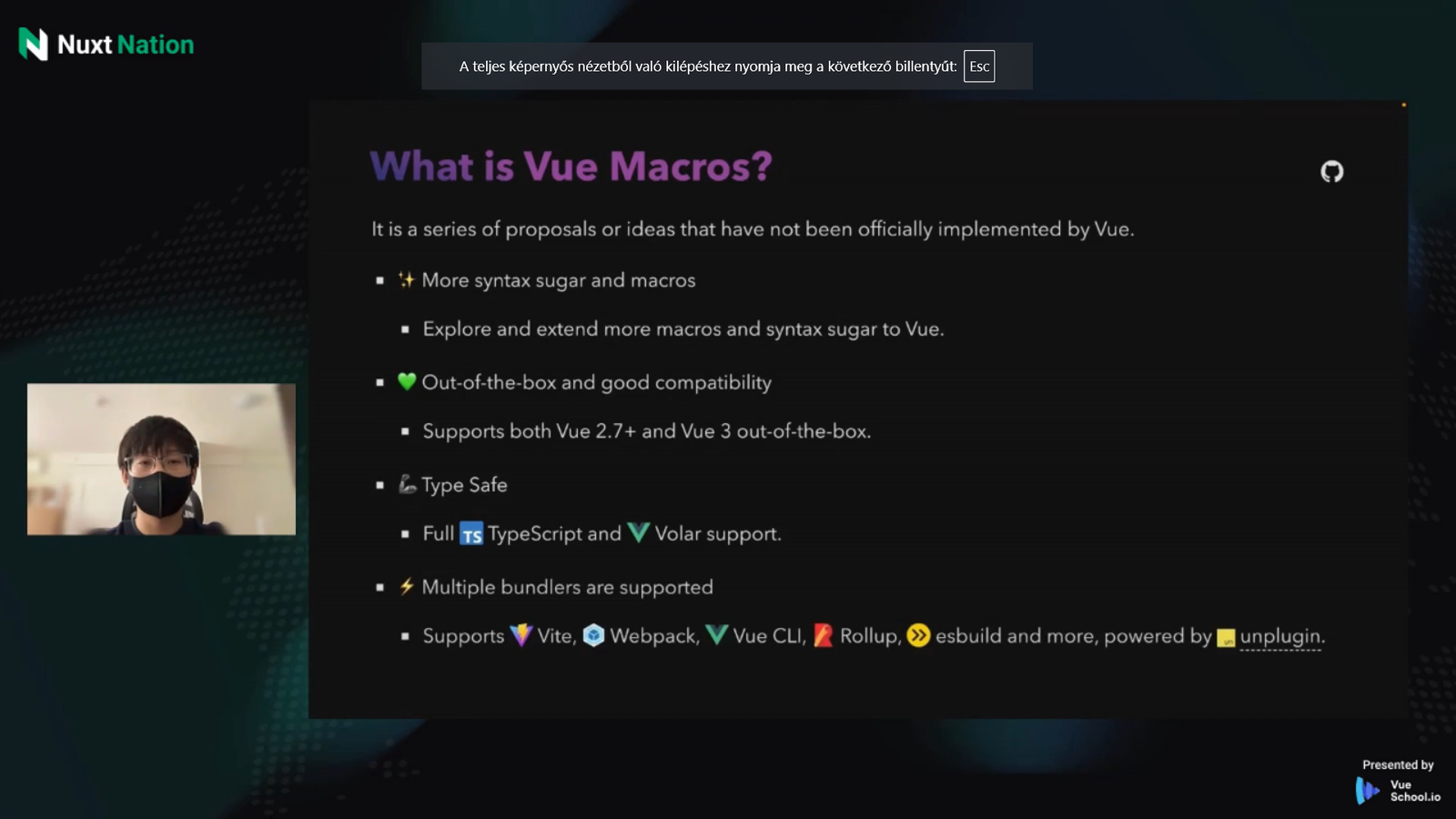After a short coffee break which we all needed from the excitement and learning, Kevin Deng was up next with a Talk on Vue macros. Kevin introduced vue macros as a series of ideas that have not been official implemented by Vue.js. They are basically syntatic sugars and shortcuts. Kevin gave a few examples