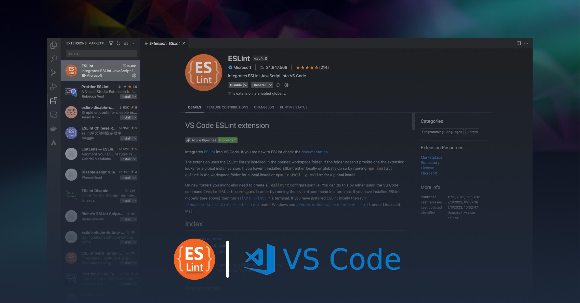 The ESLint extension integrates the awesome ESLint linter directly to enable both format your code and analyze it to make suggestions for improvement. It is also configurable. This means that you can customize how your code is evaluated.