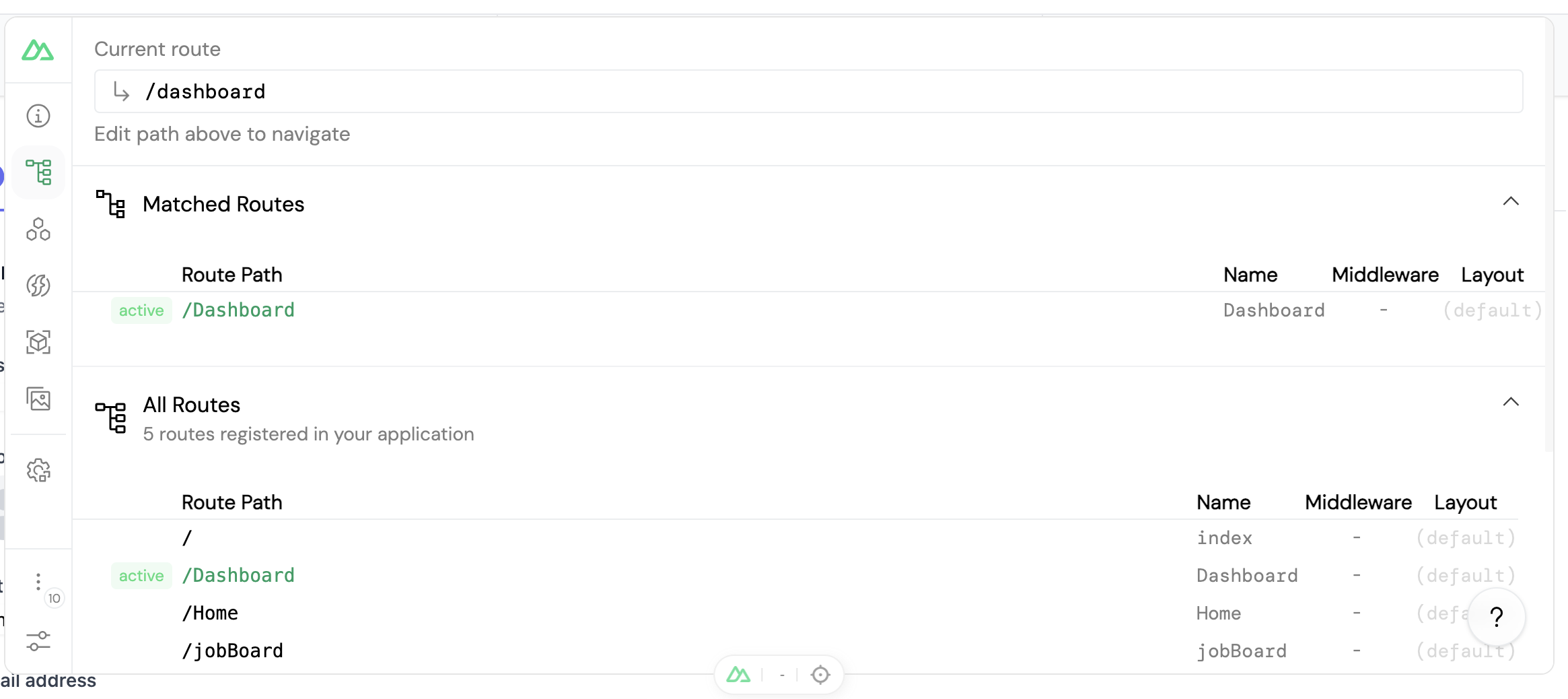 The "Pages" tab serves as a valuable resource for comprehending your file-based routing conventions. It presents you with a comprehensive list of all the possible routes that you can navigate between. Additionally, it offers a search bar where you can check if a URL corresponds to your defined routes, and by pressing "Enter," you can quickly navigate to that route.