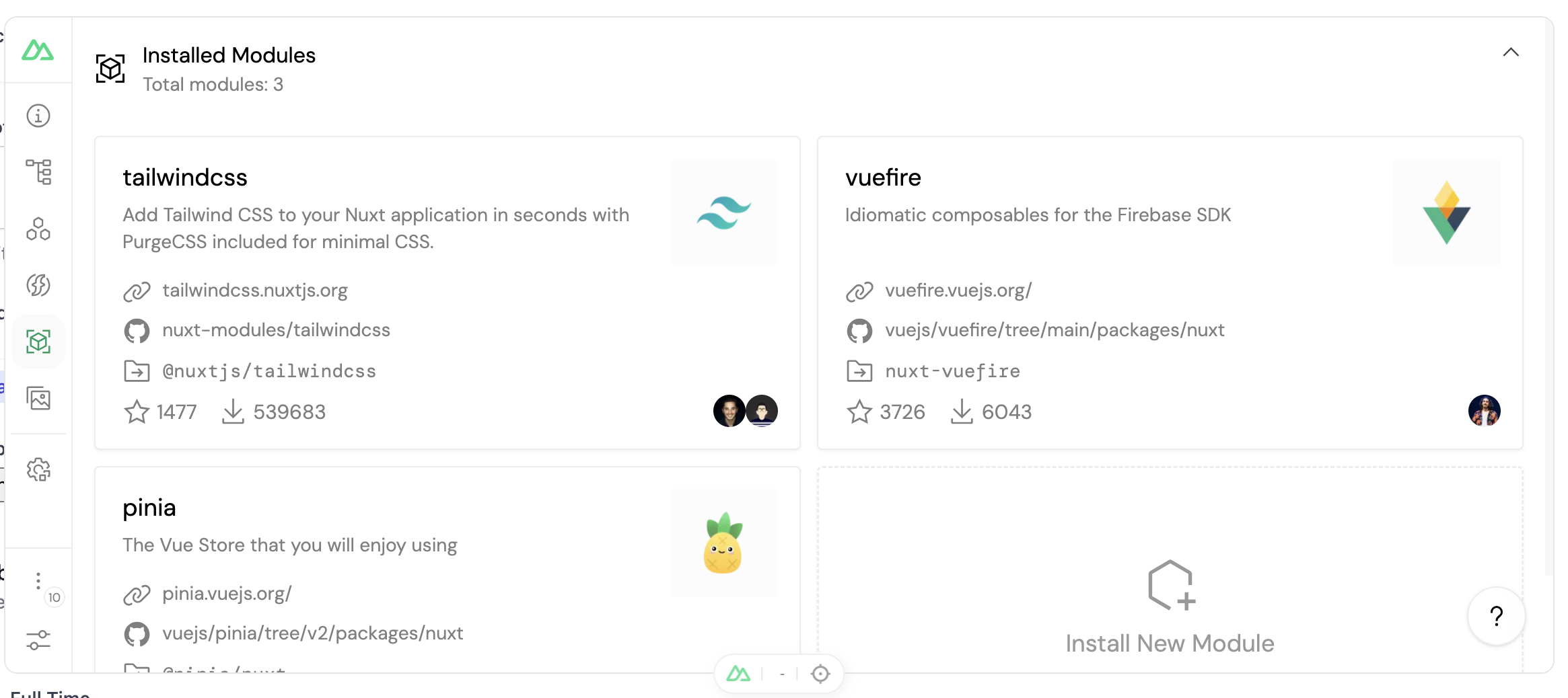 This section delivers a comprehensive overview of all the modules installed in your Nuxt project, complete with access to their documentation if it's available. Additionally, you can effortlessly install other modules from the Nuxt repository with a simple click of a button within this section.
