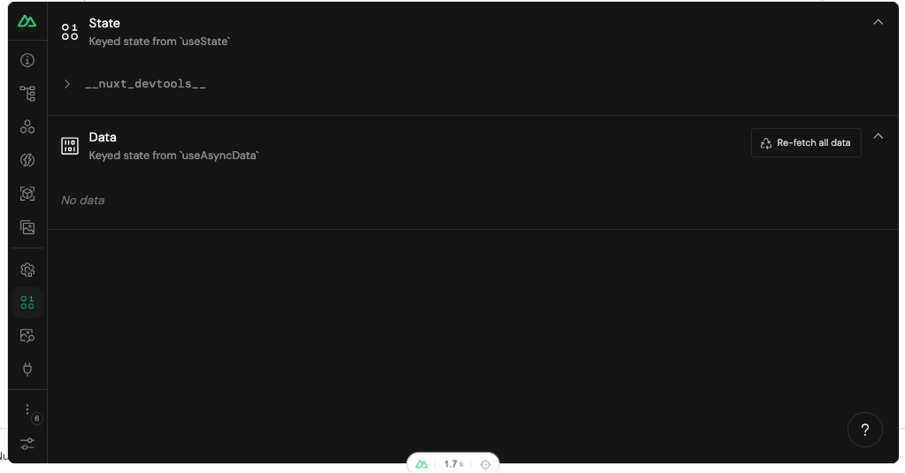 })With Nuxt Devtools now installed, you can launch it in your web browser. It will appear as a small tab at the bottom of the screen. Click on the Nuxt icon to expand it into a window with a stylish dashboard.